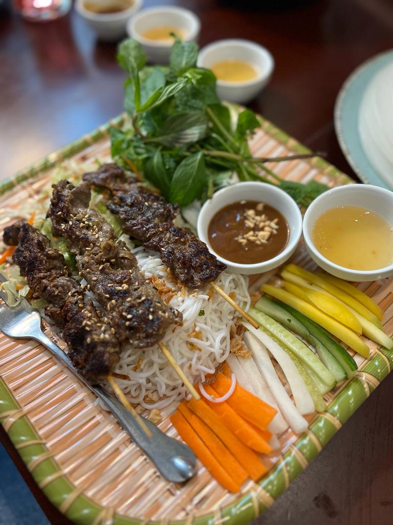 One of the restaurant's signature dishes is the Nudelsuppe mit Rindfleisch (Beef Noodle Soup), a comforting bowl filled with tender beef and aromatic herbs, making it a perfect choice for those craving something hearty and flavorful. For fans of fresh, vibrant flavors, the Bo Xien Nuong (Grilled Beef Skewers) is a must-try. The juicy skewers are grilled to perfection and paired with fragrant rice and dipping sauces, delivering a satisfying and savory bite with every taste.